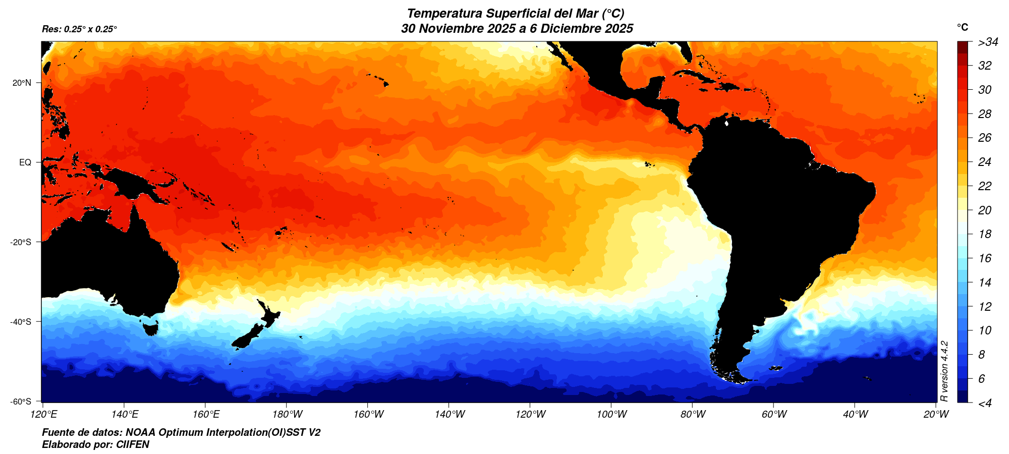 Muestra la temperatura estimada de la superficie del mar en grados celcius.
